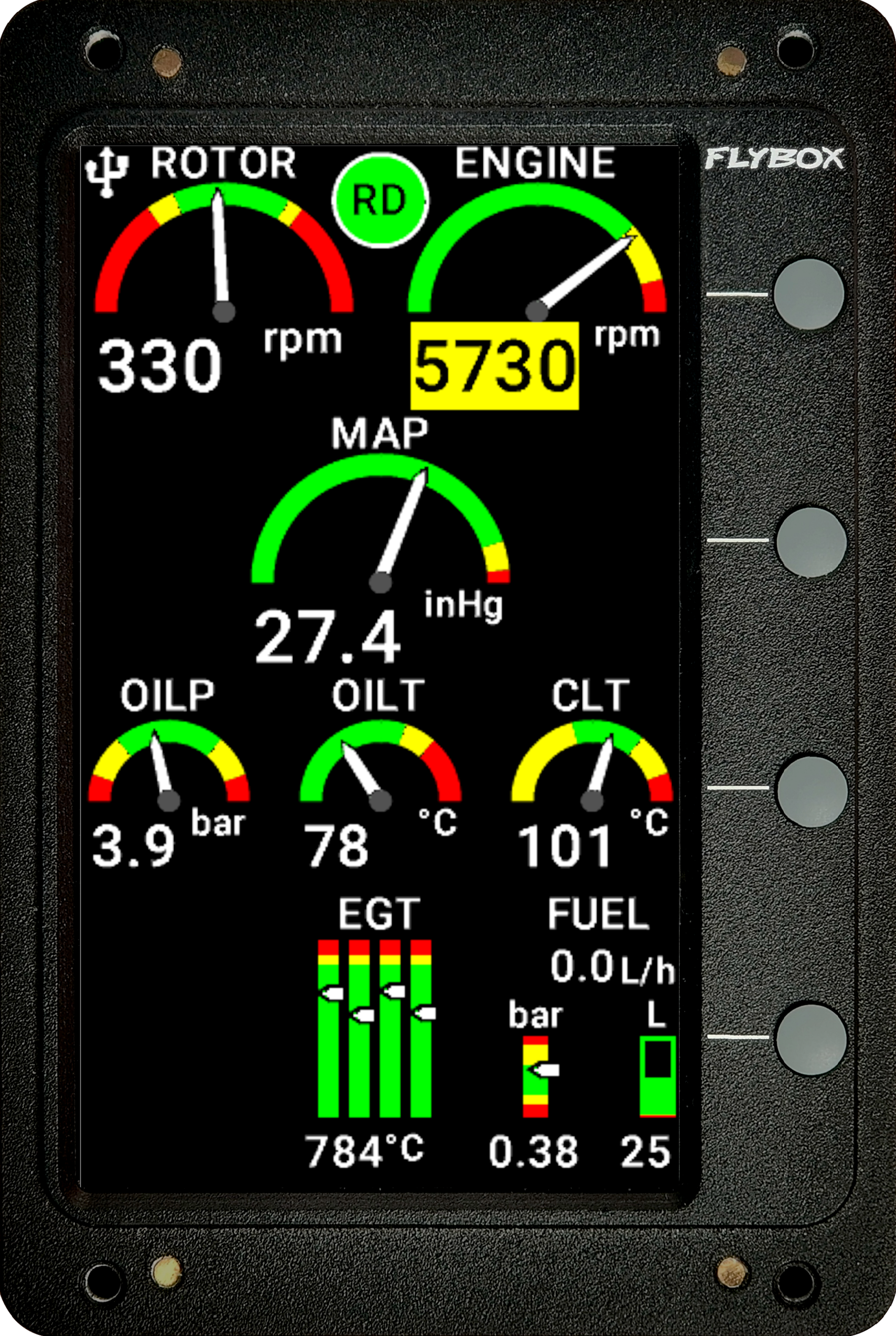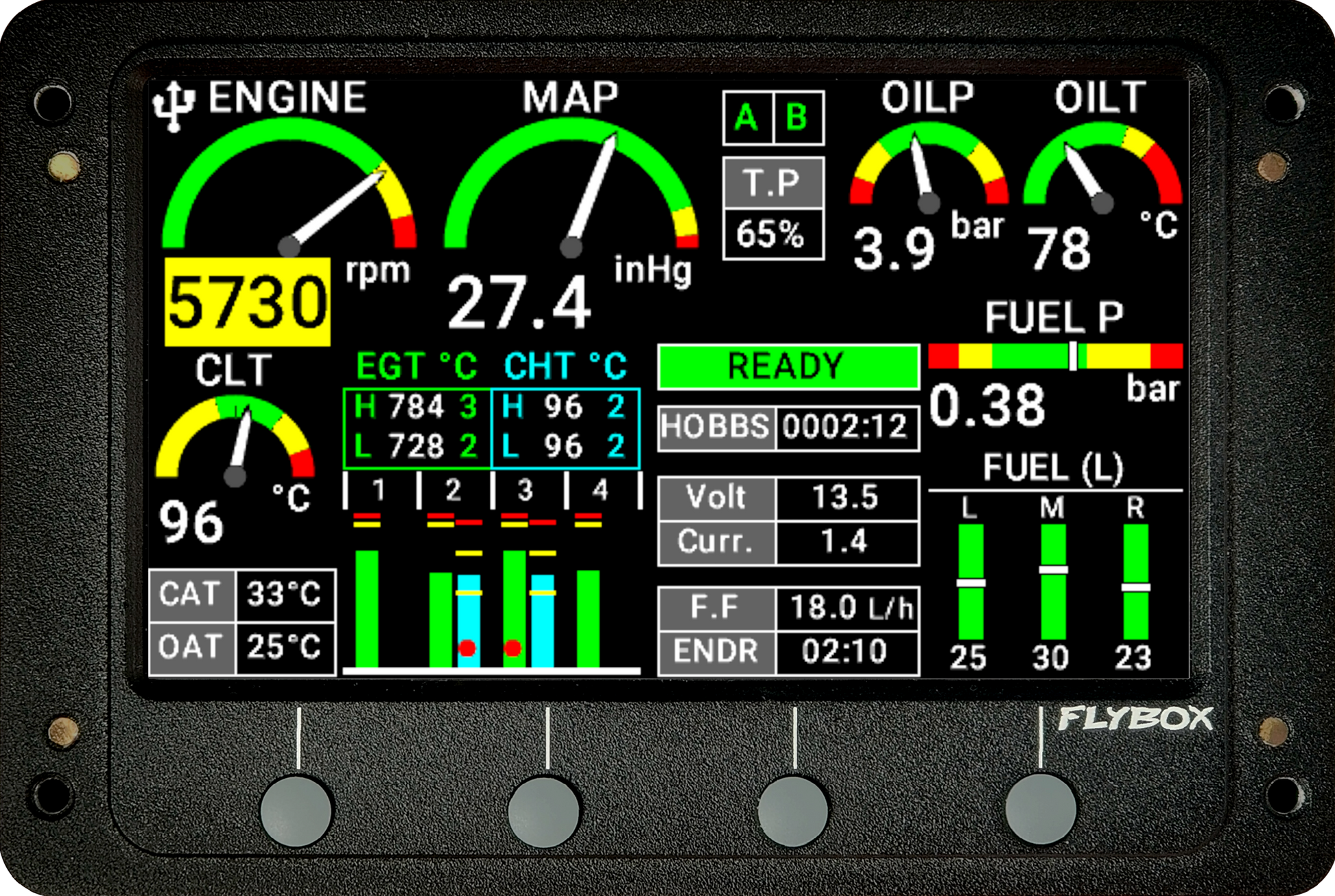 Con il suo schermo da 4,3", può visualizzare fino a 6 EGT e CHT, fornendo tutte le informazioni critiche necessarie. I dati del motore vengono campionati 20 volte al secondo, per avere informazioni aggiornate e avvisi immediati in caso di rilevamento.